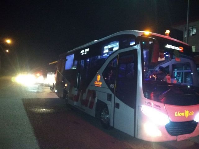 Keterangan gambar : Personel Sat Brimob Polda Kepri menuju ke landasan Bandara Internasional Hang Nadim dengan menggunakan bus milik maskapai Lion Air. (Foto : ilham)