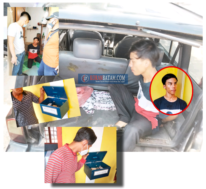 Keterangan gambar : Pelaku pencurian kotak amal Musholla Al-Ikhlas Daeng Paraga Tanjung Sengkuang. (insert kiri atas), anggota Polsek Batu Ampar ketika menginterogasi pelaku pencurian kotak amal. (insert, tengah dan bawah) warga saat menunjukkan barang bukti yang berhasil dirusak oleh pelaku pencurian. (insert lingkar) Deni Sulistiyo, pelaku pencurian kotak amal Musholla Al-Ikhlas Daeng Paraga Tanjung Sengkuang Blok D, RT 001/RW 012, Kelurahan Tanjung.