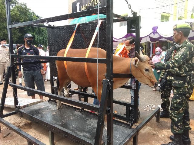 Menariknya, pada pemotongan kali ini menggunakan alat baru yakni, alat perobohan sapi. Alat tersebut tujuannya ialah untuk menjaga keamanan saat pemotongan hewan sapi atau kambing. Sapi dipotong dengan cara di ikat menggunakan sling agar, tidak berontak pada saat pemotongan atau penyembelihan.