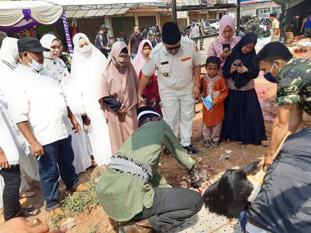 Keterangan Gambar : Pelaksanaan penyembelihan hewan qurban Pemuda Panca Marga Kota Batam, di halaman depan kantor Markas Cabang PPM Kota Batam. (Foto : iam)